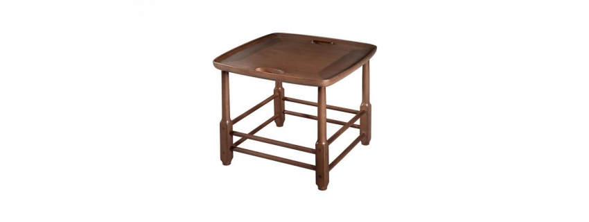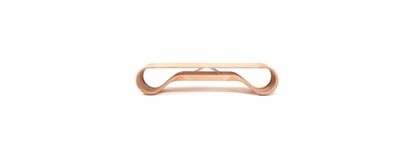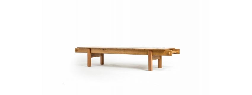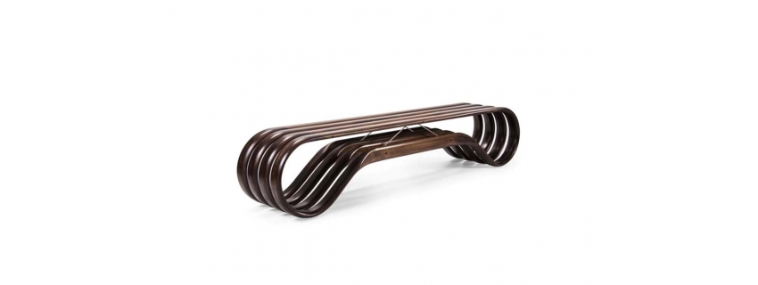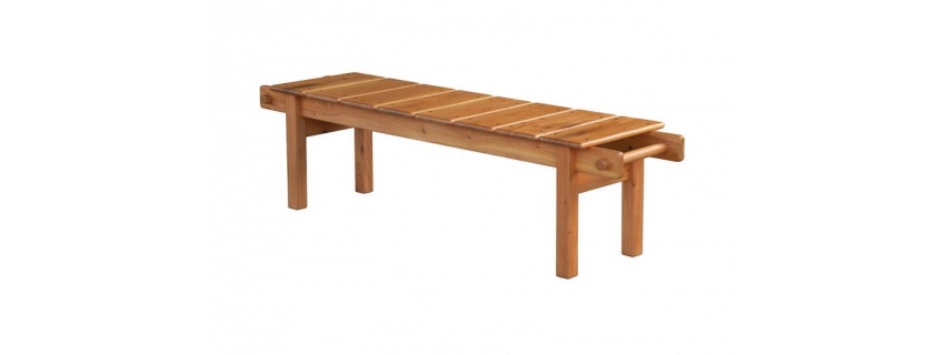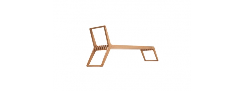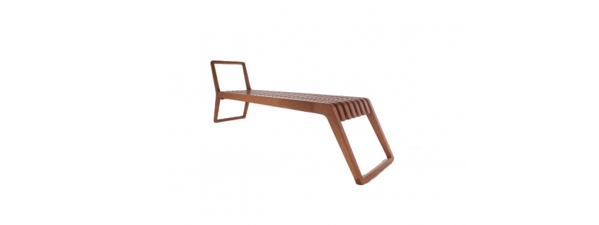 Estrutura em madeira. Assento em madeira ripada. Produto resistente a intempéries indicado para área externa.