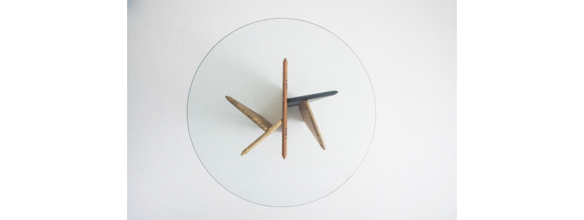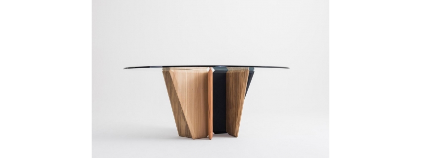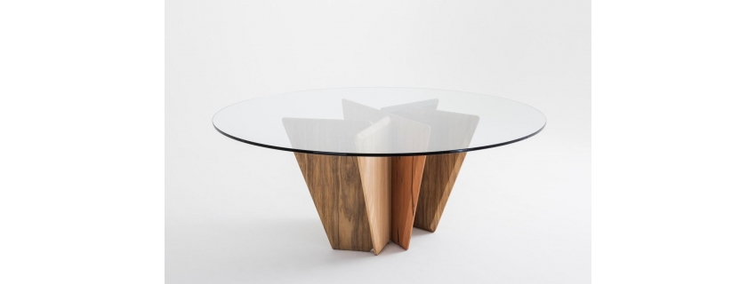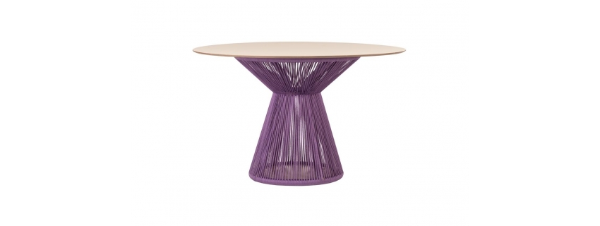 Tampo em Lyptus e MDF estruturado com aço, base em Lyptus e MDF, acabamento do tampo e base em pinturas ou lâminas.
