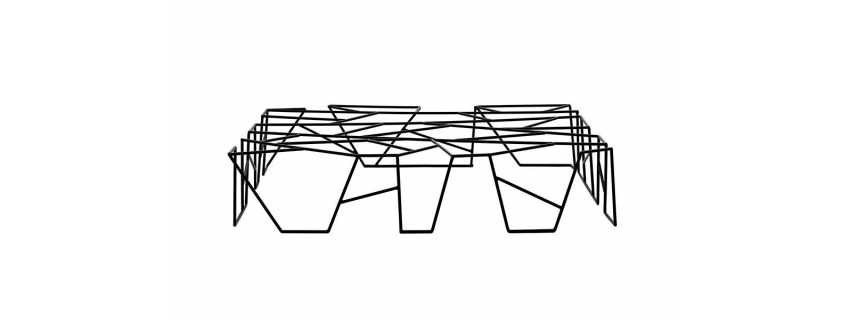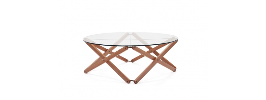 Base em madeira maciça. Op. 01 – Tampo levemente oval com acabamento interno em goffrato. Op. 02 – Tampo em lâminas especiais de carvalho, nogueira e imbuia.