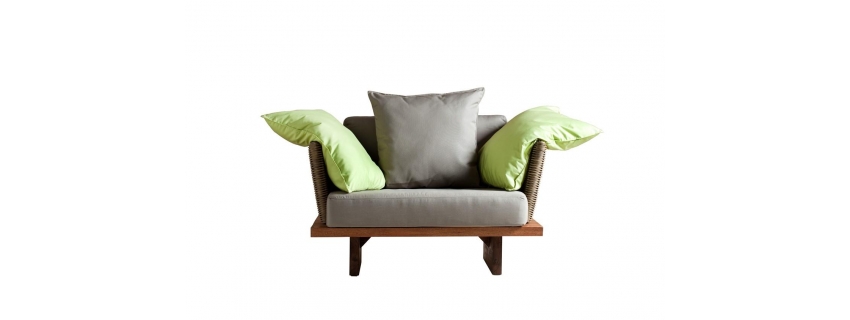 Estrutura metálica com pintura eletrostática. Assento estofado. Encosto em corda náutica. Cores a escolha. Produto resistente a intempéries indicado para área externa.